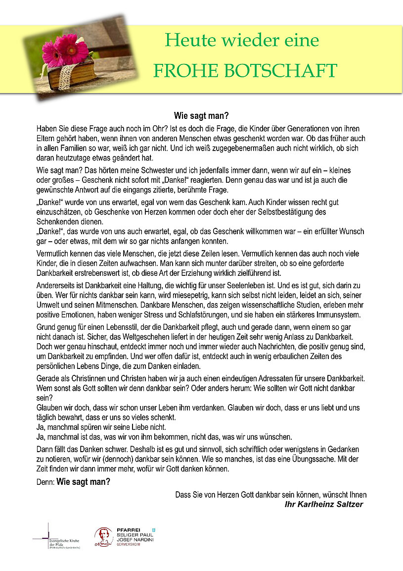 wir leben in einer Zeit, in der viele Krisen gleichzeitig zu bewältigen sind. Das ist und bleibt nach wie vor schwierig für uns alle. Wir, ihre Seelsorger*innen und Ehrenamtliche aus unseren Gemeinden, lassen Ihnen jeweils montags einen Impuls zukommen. Neben all den belastenden Nachrichten haben wir Christ*innen eine „Frohe Botschaft“, die immer gilt. Sie soll uns allen ein Licht sein.